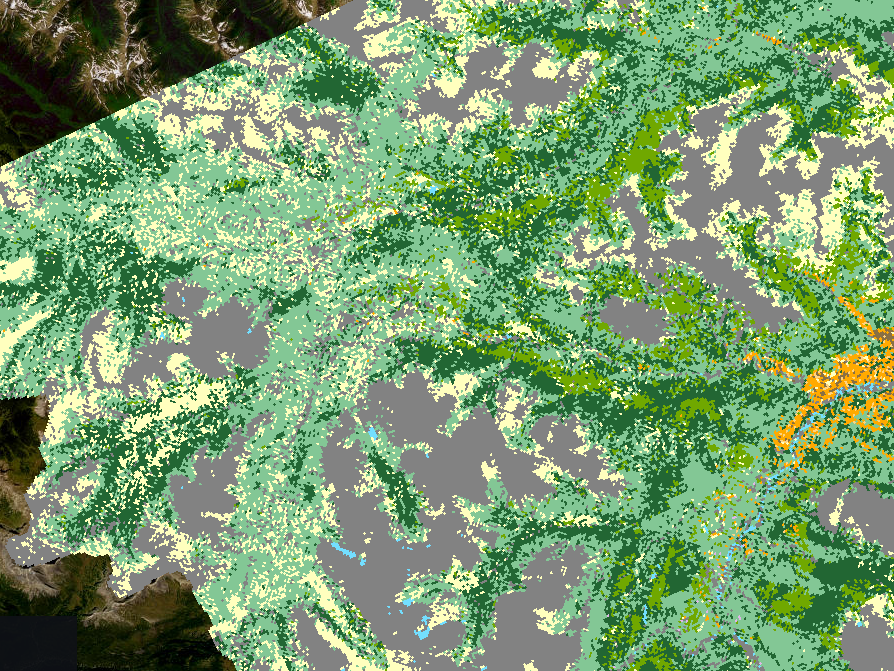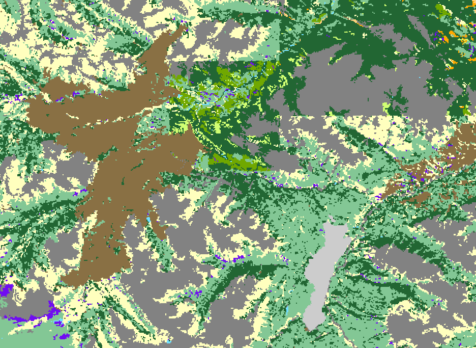 Figure 1a. Current Alberta Fire Behaviour Prediction System (FBP) Fuel Type Map of the Grand Cache area in Alberta. A large burn scar is visible as dark brown uniform fuel type. Straight lines showing artificial changes in fuel types are visible, resulting from combining different provincial data sets.