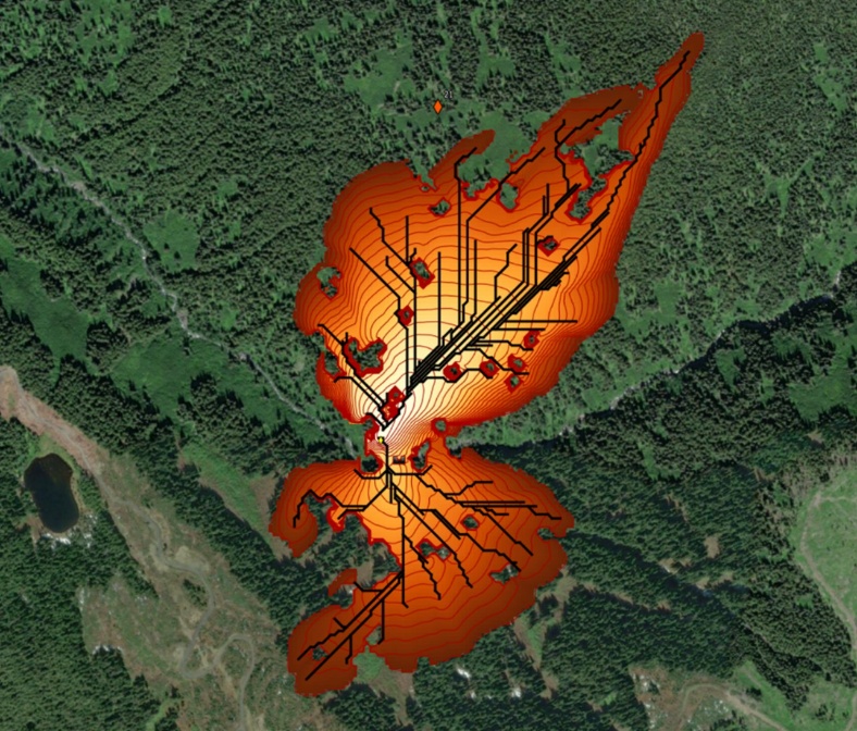 Figure 3. Example output from Pyroell, illustrating time-step perimeters and the primary fire spread pathways predicted by the model